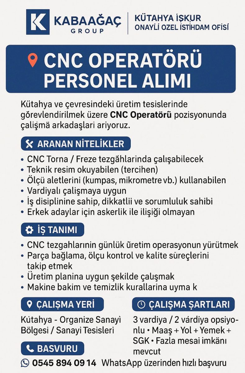 Aday yönlendirmeleri Kabaağaç Group Kütahya İŞKUR Onaylı Özel İstihdam Ofisi tarafından yapılmaktadır.